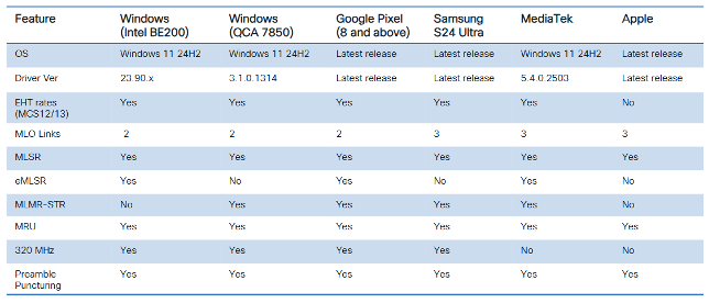 Nedenstående er et overblik over forskellige klienter og deres Wi-Fi 7 feature support.