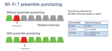 Hvis der tidligere var støj (eller interferens) på en 20 MHz kanal, i en 80 MHz samlet kanal, så var de sidste 40 MHz i kanalen spildt. Med Preample Puncturing kan den ene 20 MHz kanal med problemet udelukkes, og det resterende frekvensområde kan bruges samtidig – altså en optimering fra tidligere.