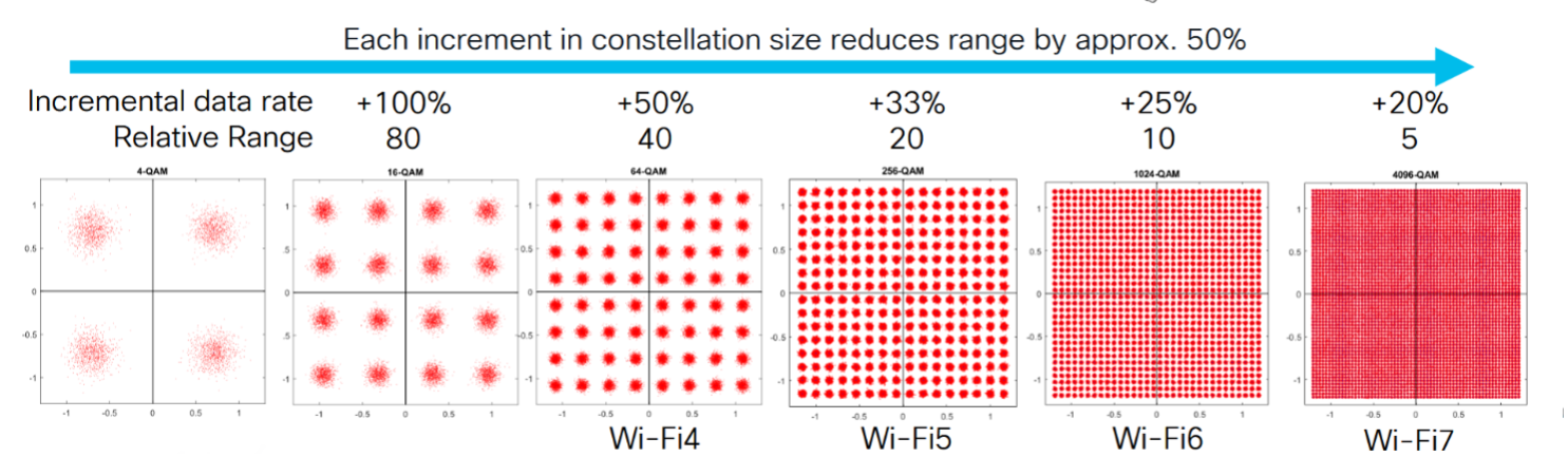 Her kan man se, at for at få en signalkvalitet (SNR), der kan bruges til 4096 QAM, hvor BER er lavt, skal man op over 30 db. Dette er den mest optimistiske graf, jeg har set. Andre dokumenter nævner et SNR helt op til 42 dB. Under alle omstændigheder skal man være meget tæt på AP for at opnå den høje modulation.